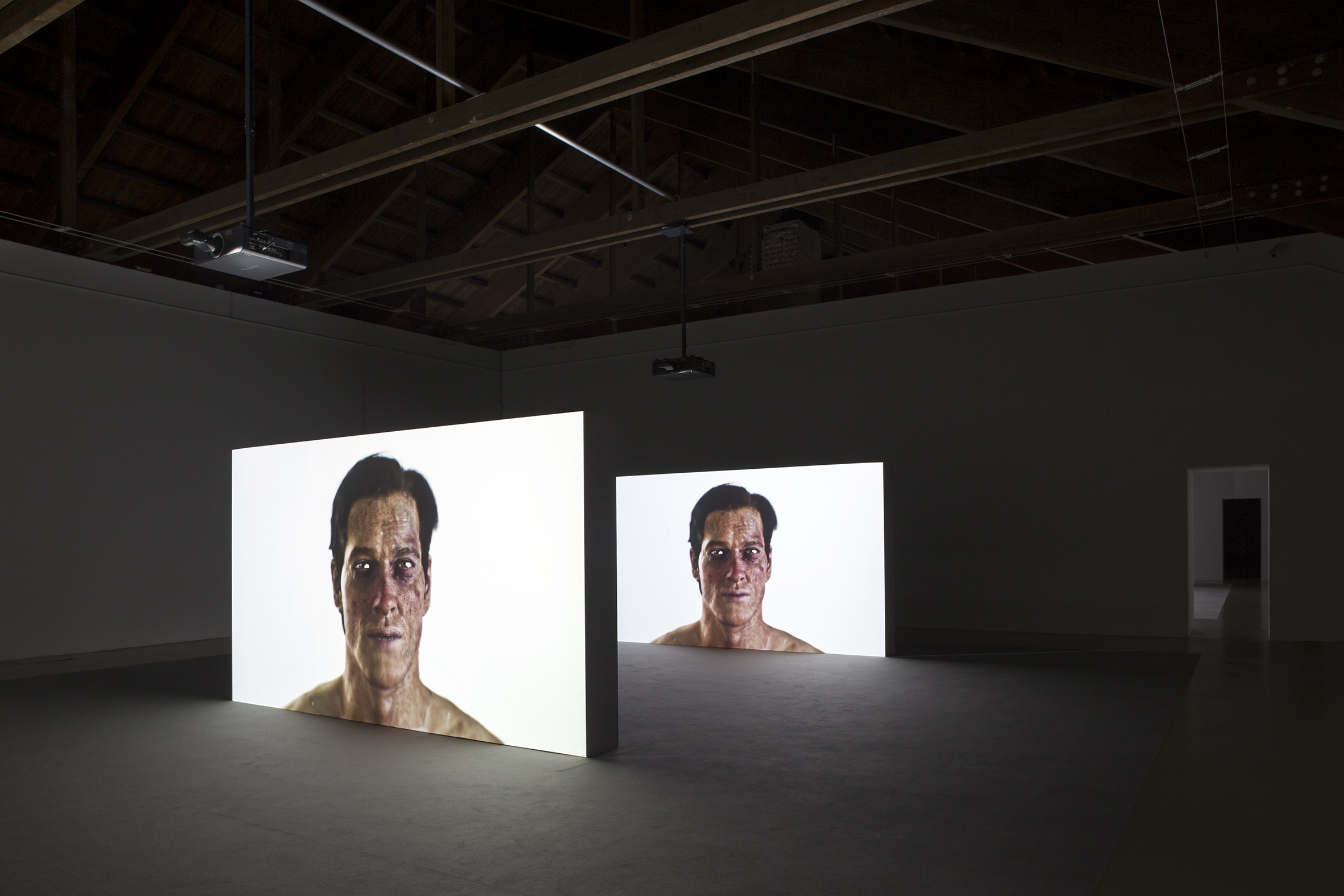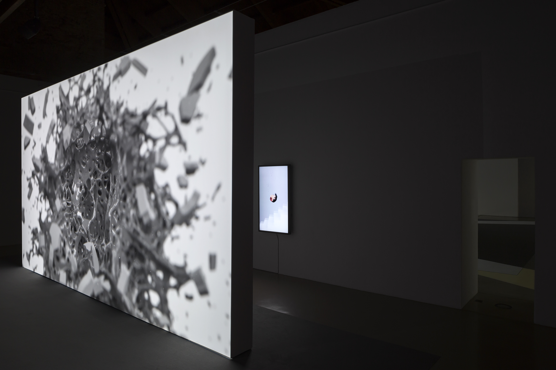 This exhibition was conceived by Ed Atkins (Oxford, 1982) as a holistic installation especially for the spaces of our museum. The ghostly aspect of the attic in our 18th century castle, with its wooden rafters exposed, is highlighted by the absence of divisions between the many video works which instead form a cacophonous crowd that come together and fall apart similarly, figured by the artist between a series of a apartments occupied by discrete individuals, and as competing thoughts within a dreaming brain. If the institution might be considered as a body, then the attic would be the subconscious where unmediated desires collide and frustrate one another. Installed in five galleries, the exhibition presents the video installations Even Pricks (2013), Warm, Warm, Warm Spring Mouths (2013), Ribbons (2014), Happy Birthday!!! (2014) and Hisser (2015), which was recently gifted to our permanent collection. In these artworks, the artist investigates existential conditions of contemporary life as filtered through the interactions of body and technology. Here, we might consider animation, literary figuration, music, performance and an underlying obsession with representing corporeality grotesquely faithfully. Atkins’ work is at once a disturbing diagnosis of a digitally mediated present-day, and an absurd prophecy of things to come. Ambivalent towards the promises of technology, the work suggests that it might be possible to salvage subjectivity through a sincere burlesque of love and hate, suspending a hysterical sentimentality within the desperate lives of the surrogate virtual characters Atkins creates.