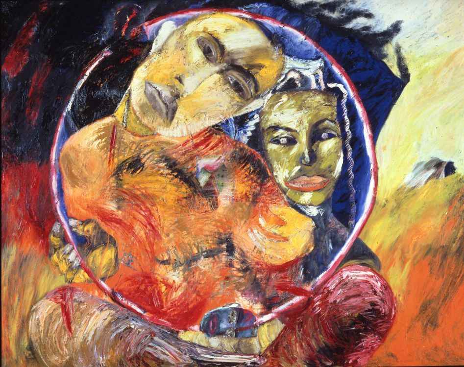 Sin dall’inizio si dedica al tema degli autoritratti, che approfondisce lungo tutto il corso della sua carriera. Spesso l’artista compare con occhi ingranditi oltre misura oppure il suo corpo è soggetto a distorsioni e deformazioni. In Autoritratto senza specchio, 1979, la postura scorretta delle gambe e delle braccia rappresenta una modalità per affrontare il mondo da un’altra angolazione, lontana dalla visione corrente della maggioranza delle persone.