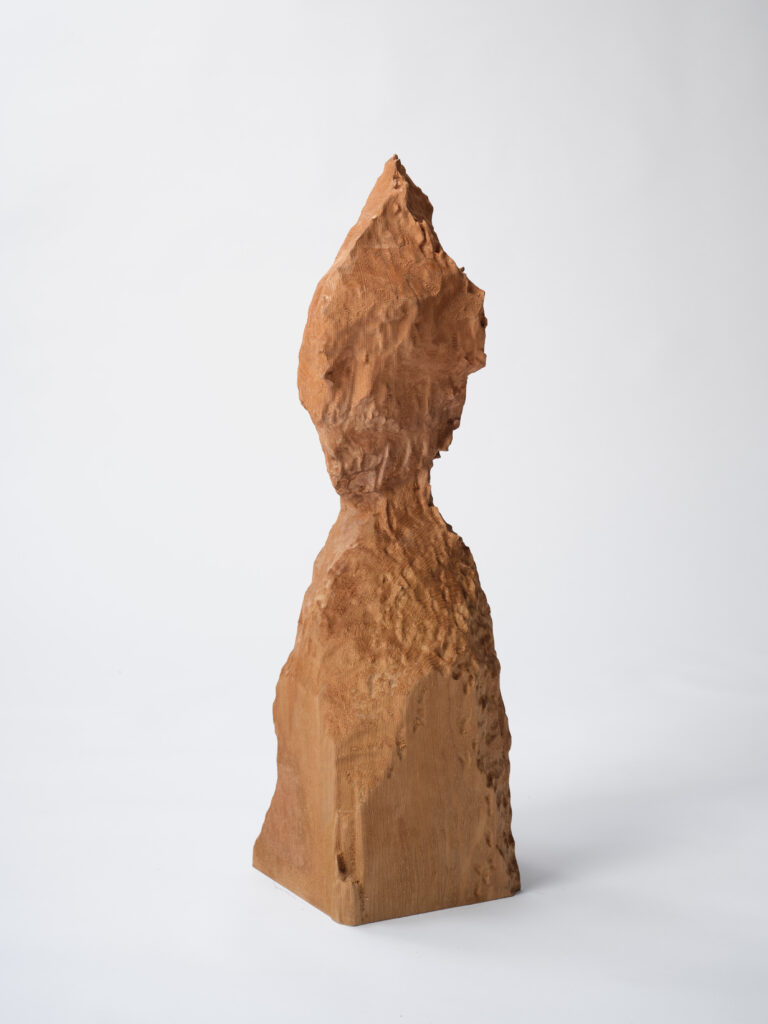 La forma delle sculture di Inomata ricorda le complesse architetture lignee costruite dal Castor fiber Linnaeus, una particolare specie di castoro diffuso in Eurasia che è solito masticare gli alberi per abbatterli e costruirvi delle dighe. Per la loro realizzazione, l’artista si è affidata allo scultore Takeno Yumi e all’azione di una macchina da taglio automatica (CNC): copie degli alberi rosicchiati dai castori, le sculture esplorano le possibilità umane e artificiali di riproduzione di un oggetto frutto dell’azione animale. Ad accompagnare i due lavori scultorei, documenti e video svelano al pubblico il processo creativo dietro la produzione dell’opera. Ripensando la definizione di azione scultorea, l’artista suggerisce nuove e inaspettate possibilità di collaborazione e di dialogo con la natura.