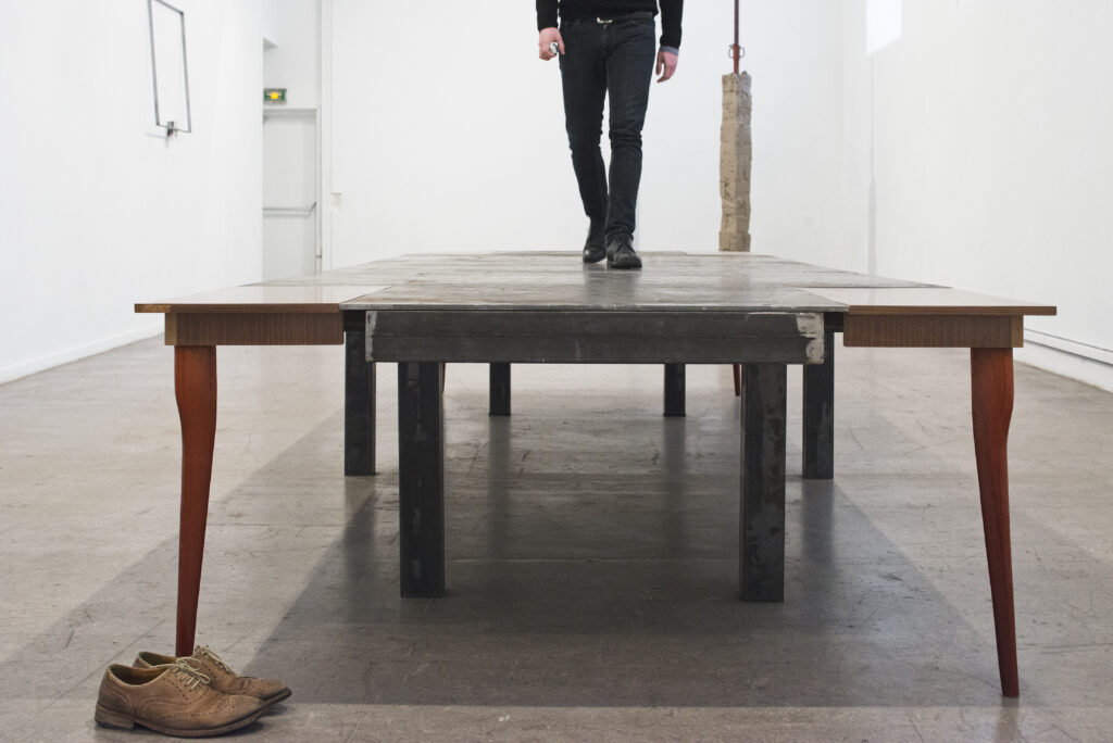 Francesco Arena draws inspiration from characters and events that have marked history and translates them into an anthropometric key for his works. Mare della Tranquillità, 2013, is a used dining table, which the artist cut and reassembled with a metal top to reach the measurements of the table where the German surrender was signed on May 7, 1945 in Reims, France. Mare della Tranquillità includes Superficie con linea, a performative component that can be activated when the sculpture is on display to the public. The action consists of the presence of a performer who, for days and with the necessary breaks, walks along the table from one end to the other, until he has walked 155 km, the original length of the Berlin Wall.