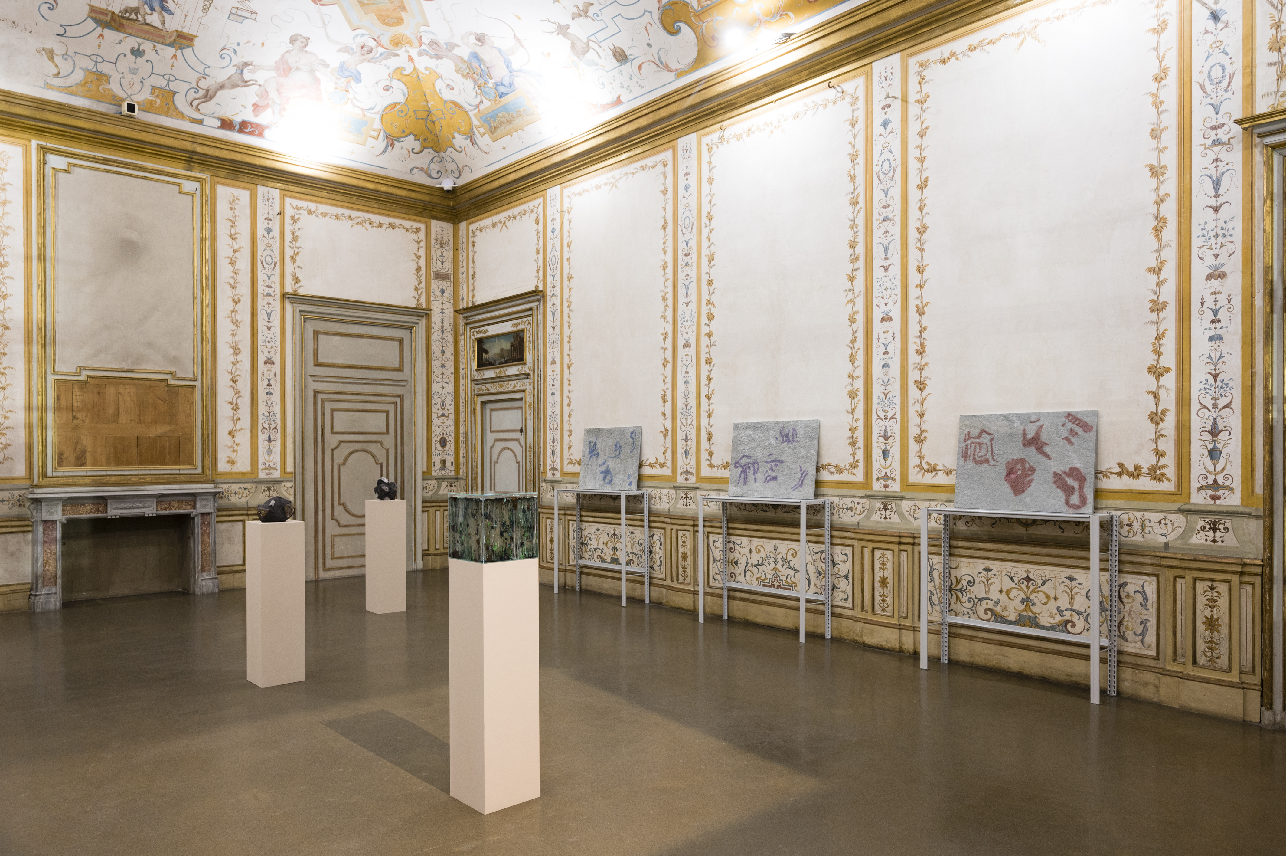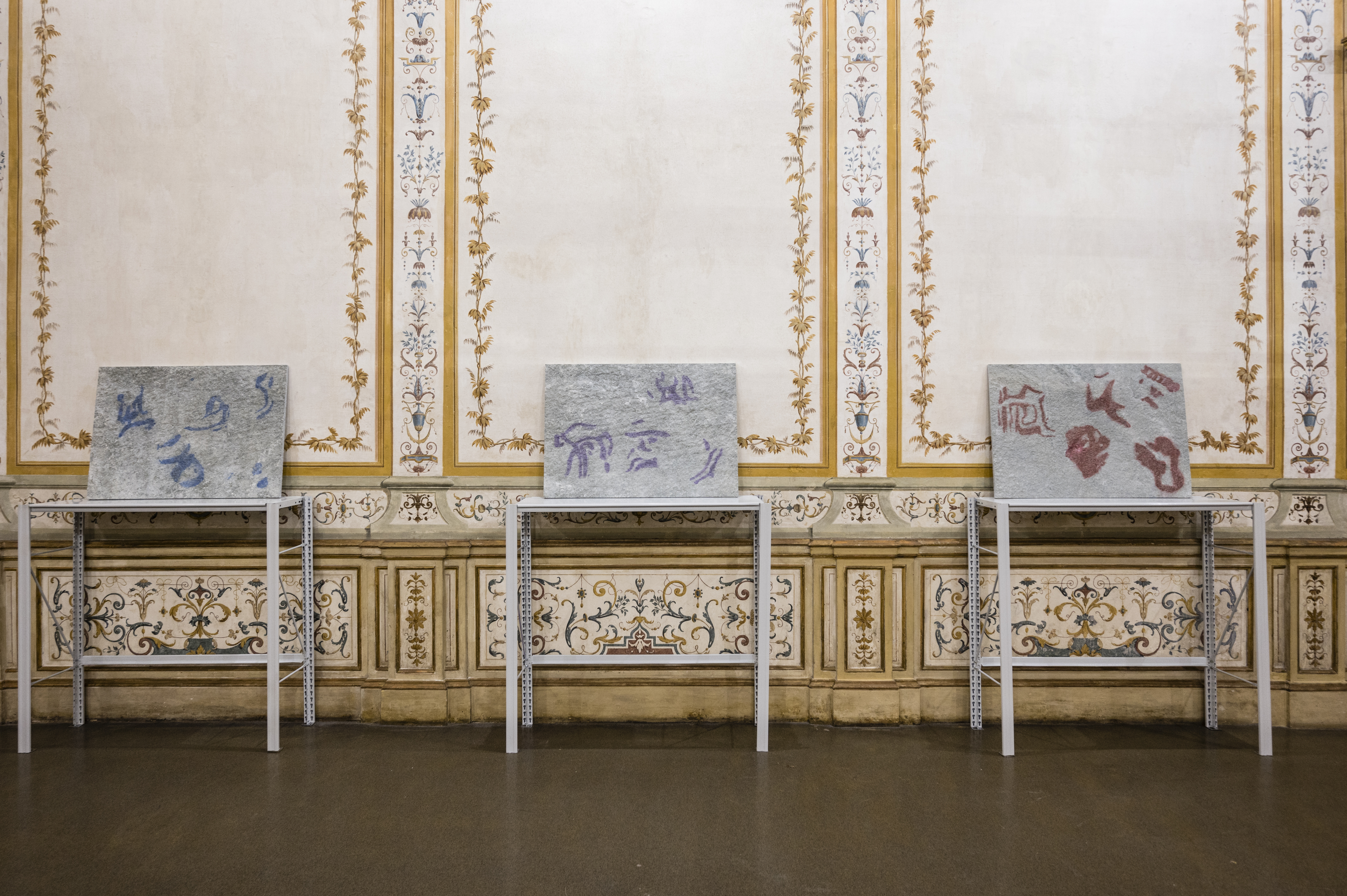 Il Castello di Rivoli produce infine l’opera inedita Adjacent Possible (Possibile adiacente, 2021), una serie di opere su pietra di Luserna che propongono una riflessione su possibili direzioni in cui la cultura umana avrebbe potuto evolversi o si sta attualmente evolvendo. Nello sviluppo di questo progetto, l’artista ha collaborato con gli scienziati sociali computazionali LeRon Shults and Justin Lane per applicare una rete neurale artificiale a un archivio di migliaia di fotografie che riproducono le varie iterazioni di 32 segni grafici documentati nelle caverne Paleolitiche in Europa e in Asia dalla paleoantropologa Genevieve von Petzinger. Il progetto genera altri potenziali segni e forme di espressione come prodotti della soggettività colletiva. Nel corso dei secoli alcune pitture rupestri sono state colonizzate da batteri e funghi, sostituendo i pigmenti originali. Attraverso la collaborazione con biologi sintetici, l’artista realizza nuovi dipinti utilizzando pigmenti di colore contenenti batteri mutati con geni di coralli e meduse, nonché funghi e licheni come “pigmenti vivi”.
