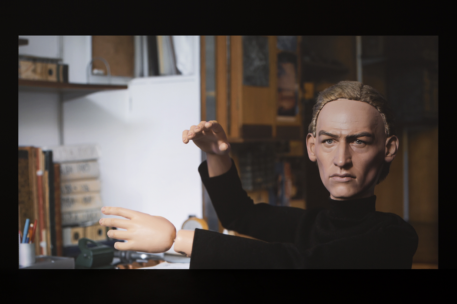 A partire dalla relazione tra essere umano e nuove tecnologie, l’artista si sofferma sul valore delle emozioni nella società contemporanea indagando le nuove forme della soggettività umana. Amos’ World è una video installazione, concepita come uno show televisivo in tre episodi.
