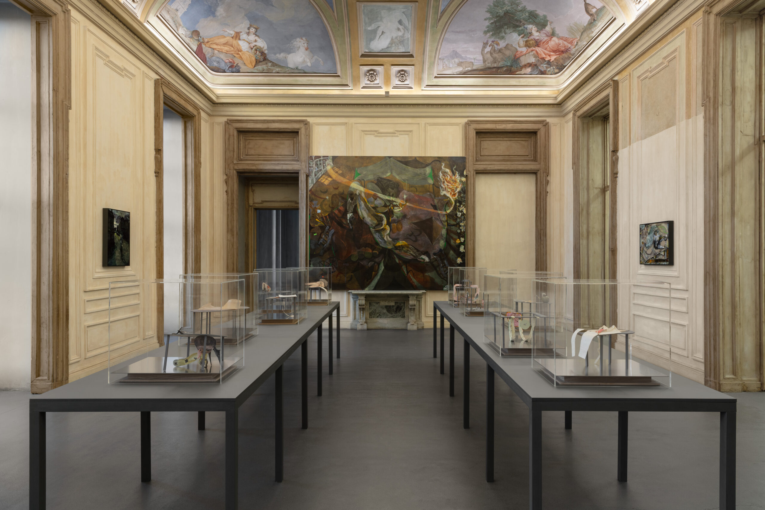 Alle pareti, una serie di nuovi dipinti – tra cui uno monumentale di oltre tre metri – raffigurano le atmosfere fantastiche e condensate tipiche di Castelli in cui si svolgono molteplici azioni, ripetute cadute e altrettanti fallimenti.