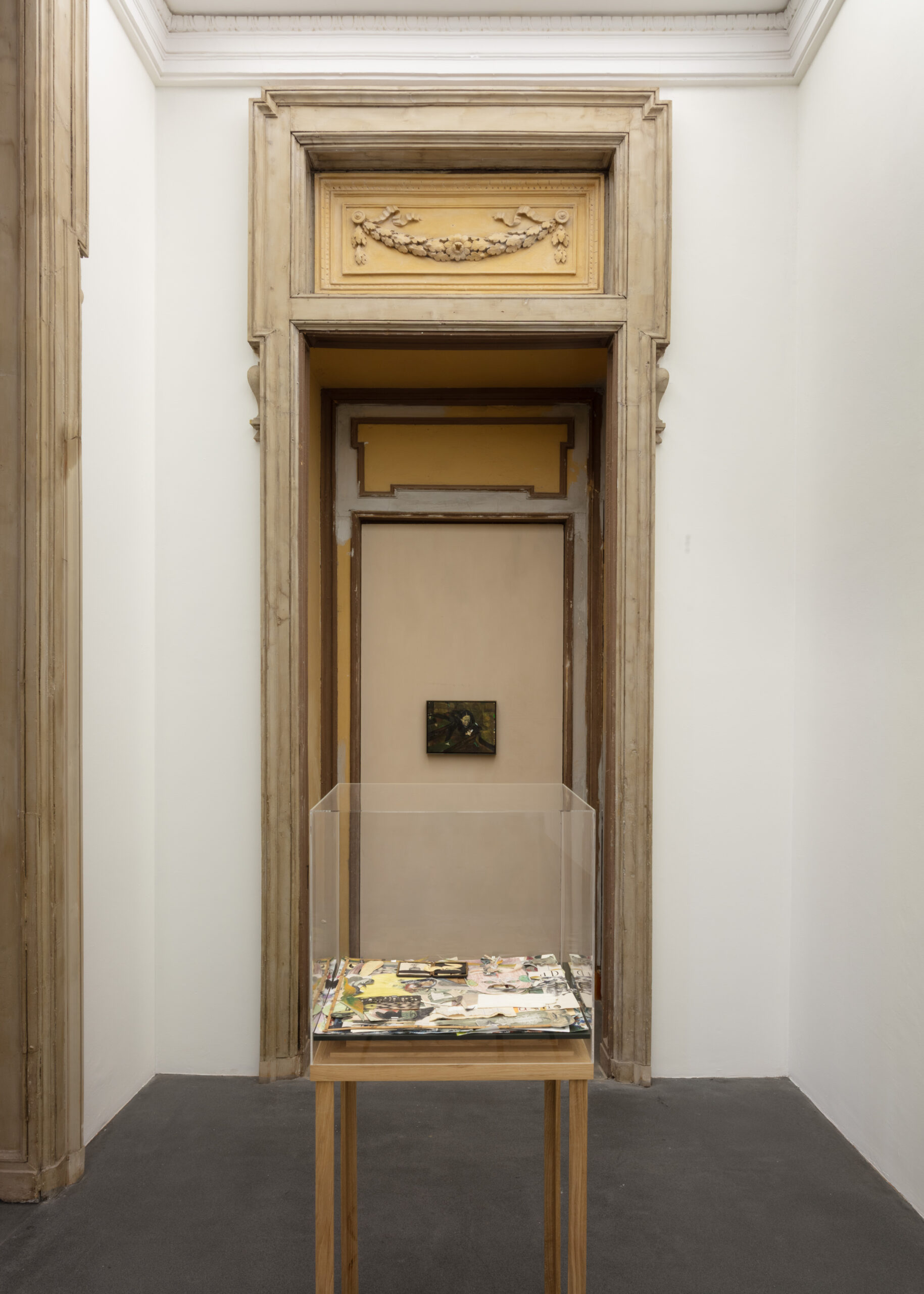 Nella sala adiacente, lunga e sottile, sono esposte alcune opere su carta e per la prima volta una speciale presentazione dei materiali preparatori e dei quaderni di schizzi di Castelli, che comprendono studi per i personaggi del suo mondo inventato, apparenti scarti che divengono ecosistema e stratificazione insieme a prove di composizione che rivelano il processo di realizzazione dei suoi quadri.