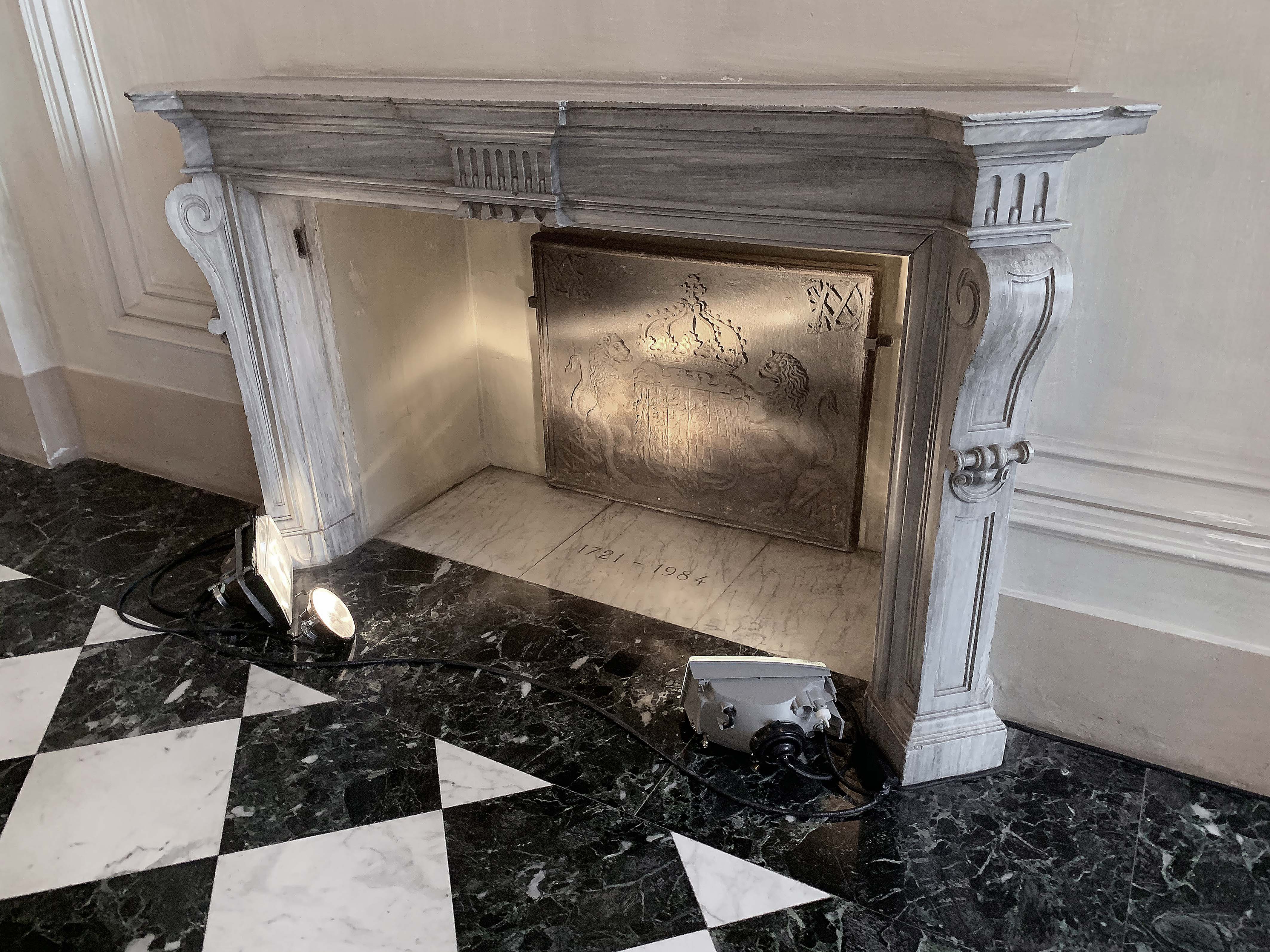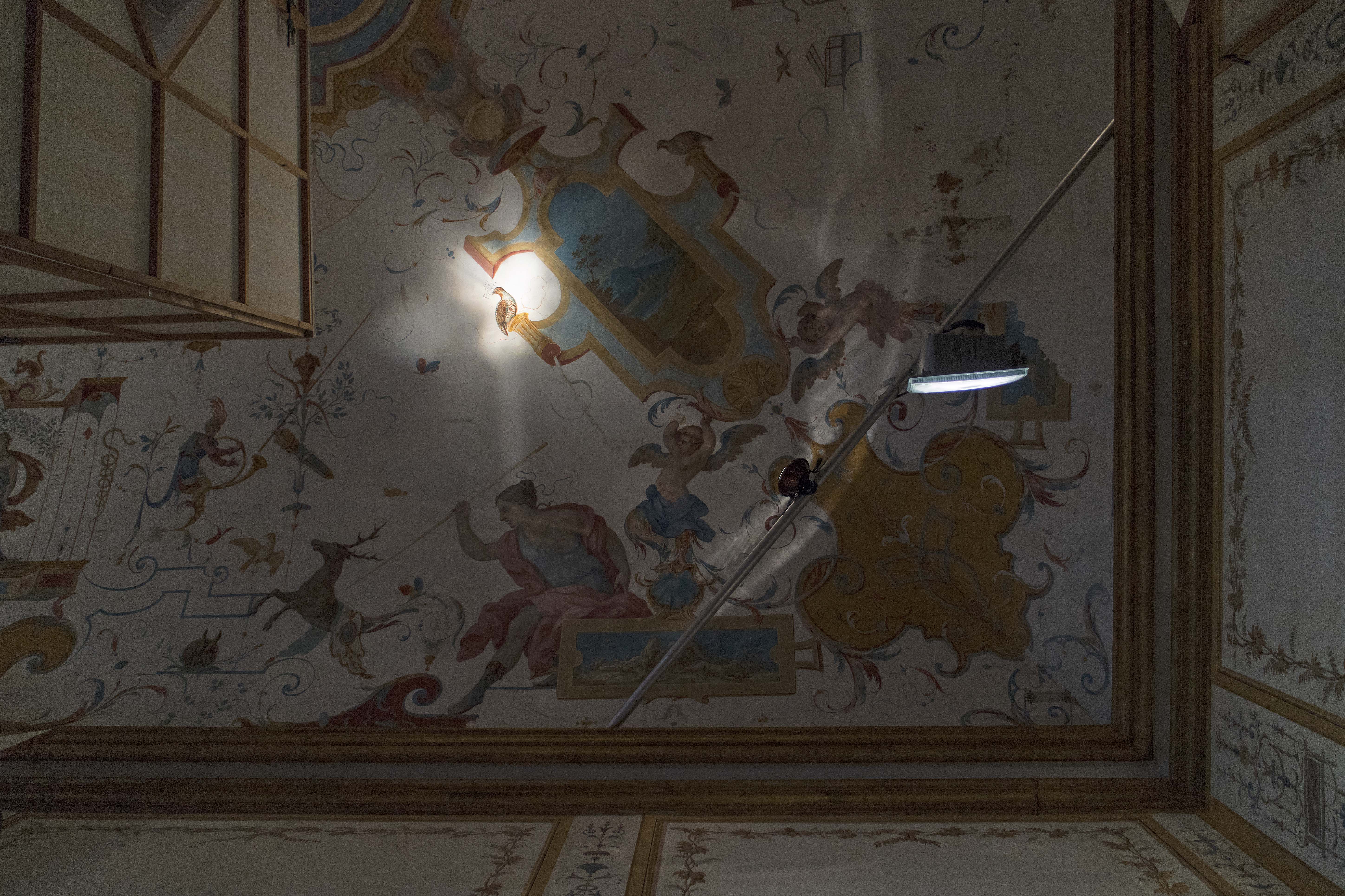 Partendo dai dettagli architettonici e artistici delle sale della Residenza Sabauda, l’opera di Leotta crea un percorso immaginario negli spazi del Museo in cui i fasti del passato settecentesco sabaudo espressi nei motivi araldici, nelle decorazioni e negli affreschi, sono metaforicamente illuminati dai fari delle automobili.