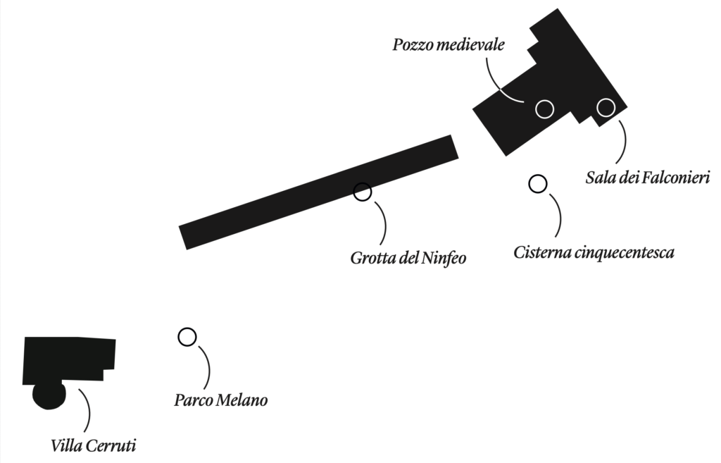 Promenade, 2023, è un’opera in cui Ramona Ponzini invita il visitatore ad accedere a luoghi fisici e immaginari attraverso le qualità del suono. L’artista ha registrato i rumori e la risposta spaziale al proprio canto nei giardini della Villa Cerruti, del Parco Melano, fino a raggiungere ambienti del Castello di Rivoli inaccessibili ai visitatori: la Sala dei Falconieri, la Grotta del Ninfeo, la Cisterna cinquecentesca e il pozzo medievale. In un esercizio di riposizionamento aurale nello spazio fisico, che evoca la pratica del “bagno nel bosco” di origini giapponesi (shinrinyoku), i field recordings elaborati da Ponzini restituiscono le caratteristiche sonore dei luoghi sondati.